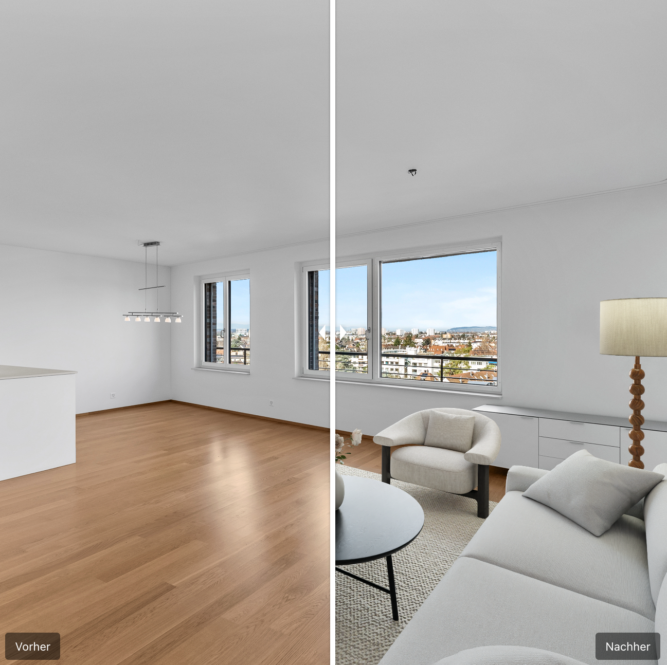 Virtuelle Möblierung, Objektentfernung und Retusche zur optimalen Präsentation.